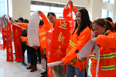 “春滿人間百花吐艷 福臨小院四季常安” “一帆風順年年好 萬事如意步步高” ……1月26日至28日,麗匯大廈一樓熱鬧非凡,為了感激社會各界對綠港集團的關心與支持,由綠港集團工會組織的書法家“迎新春 送祝?!绷x務送春聯(lián)活動吸引了大量前來求墨寶的社會各界人士。三位南寧市書法協(xié)會的書法家以及南寧科巨公司副總經(jīng)理陸章發(fā)為觀眾們現(xiàn)場揮毫,一幅幅金燙燙、散發(fā)著墨香的春聯(lián)映襯著人們的笑臉,整個現(xiàn)場彌漫著濃濃的年味,短短三天時間便送出了2000多副春聯(lián)。1月26日上午,綠港集團工會還啟動了派送春聯(lián)儀式,綠港集團工會主席黃麗琴帶領工會人員將春聯(lián)送到經(jīng)開區(qū)40余位保潔人員、園林綠化工人、公司職工的手上。(張彩秀/文、圖)