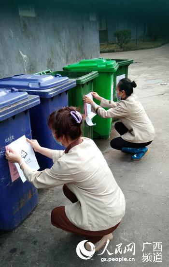 綠港集團(tuán)物業(yè)員工張貼垃圾分類標(biāo)識。朱春生攝