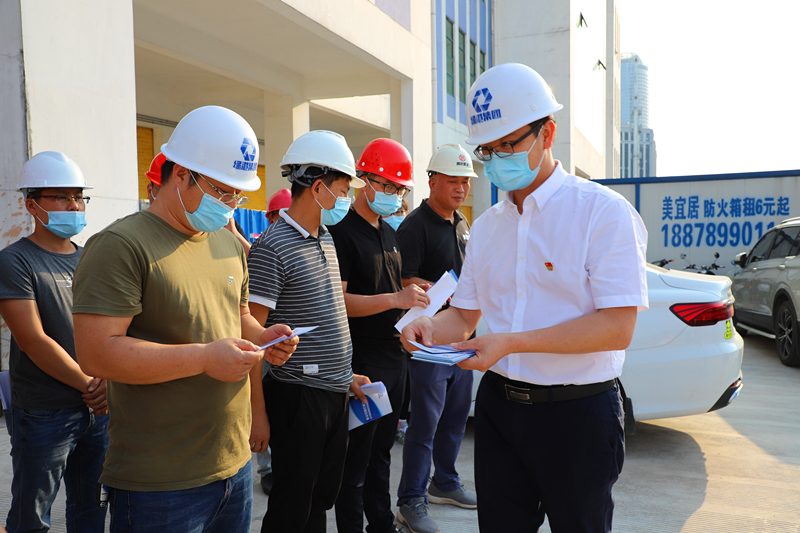 綠港集團(tuán)黨委書記、董事長龔國強(qiáng)給項(xiàng)目一線人員發(fā)放《工程建設(shè)廉政手冊》(張彩秀 攝)