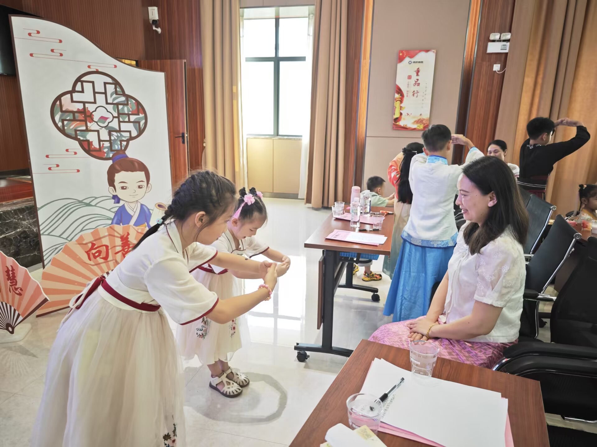 活動以傳統(tǒng)禮儀的學習和體驗為主題,此次培訓邀請了廣西經貿職業(yè)技術學院智慧商務產業(yè)學院的老師韋斯斯講授少兒禮儀知識。活動中,老師向孩子們講解了《弟子規(guī)》中學習的重要、做人的道理以及待人接物的禮貌常識,讓大家更好地理解傳統(tǒng)的禮儀。韋老師親身示范,教授大家如何正確行認知禮儀、家庭禮儀、餐桌禮儀、待客禮儀、交往禮儀、入泮禮、作揖禮、孝道禮儀等,在抬手躬身中感受禮儀之邦的古韻,學習尊師重教的品德。老師結合理論知識學習,邀請孩子們上臺實操演練,模擬情景表演、開展親子互動小游戲等,孩子們紛紛上臺,為大家展示,將學到的文明禮儀知識落實到行動中,培訓現(xiàn)場生動形象、氣氛熱烈,孩子們全神貫注聽取老師的講解,依照老師的示范,認真的學習禮儀,體驗傳統(tǒng)禮儀。