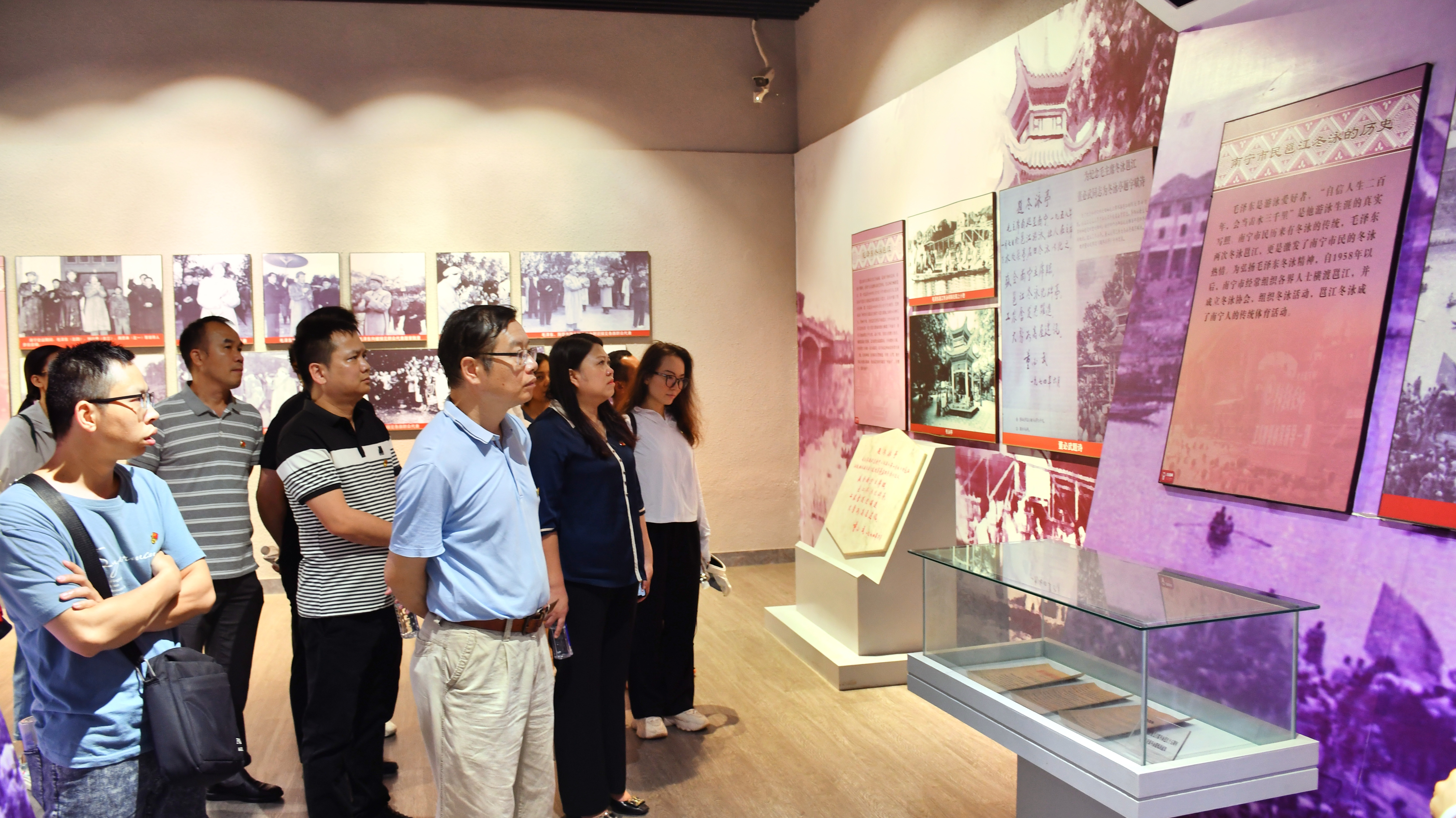 走進(jìn)紀(jì)念館大門,一塊浮雕作品映入眼簾,它再現(xiàn)了1958年毛澤東主席在人民公園望仙坡接見廣西各族人民代表的壯觀場景。時(shí)隔60多年,追尋偉人的足跡,我們一起回憶那段激動(dòng)人心的光輝歲月。紀(jì)念館通過實(shí)物、圖片、文字資料的組合,配以聲、光、色等現(xiàn)代科技手段,展示了1958年1月毛澤東主席在南寧主持召開中央工作會(huì)議期間,接見廣西各族人民代表,對(duì)廣西地方經(jīng)濟(jì)發(fā)展作出高瞻遠(yuǎn)矚指導(dǎo)的活動(dòng)情況,以及劉少奇、周恩來等黨和國家領(lǐng)導(dǎo)人指導(dǎo)廣西社會(huì)主義現(xiàn)代化建設(shè)的歷程。黨員們跟隨著一幅幅照片回顧了人民公園、邕江河畔、軍區(qū)禮堂等毛澤東主席在廣西的歷史足跡和廣西發(fā)展歷史。參與主題參觀學(xué)習(xí)的黨員紛紛表示:“講解員的解說非常讓人心潮澎湃,參觀活動(dòng)是思想上的傳承,激勵(lì)我們帶著這份信念和力量,追隨偉人的足跡,把南寧建設(shè)得更加美好。”